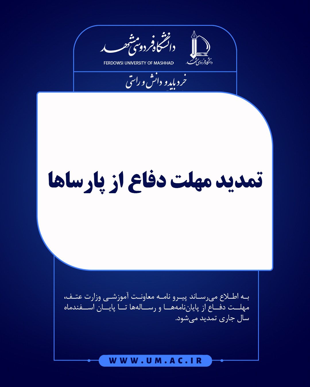 تمدید مهلت دفاع از پارساها ارسال شده در تاریخ : دوشنبه ۱۳ بهمن ۱۴۰۴ پیرو نامه معاونت آموزشی وزارت عتف، مهلت دفاع از پایاننامهها و رسالهها تا پایان اسفندماه سال جاری تمدید میشود.