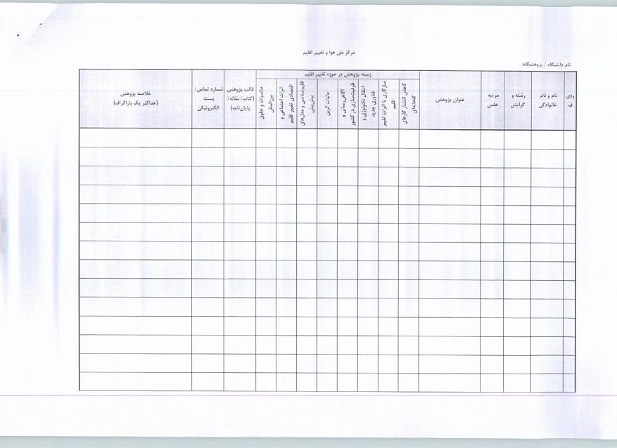 اساتید و پژوهشگرانی که در زمینه موضوعات تغییر اقلیم صاحب نظر و دارای صلاحیت میباشند، میتوانند رزومه کامل و خلاصهای از پژوهشهای انجام شده خود را در قالب فایل ضمیمه شده به معاونت محیطزیست انسانی سازمان حفاظت از محیطزیست ارسال نمایند.